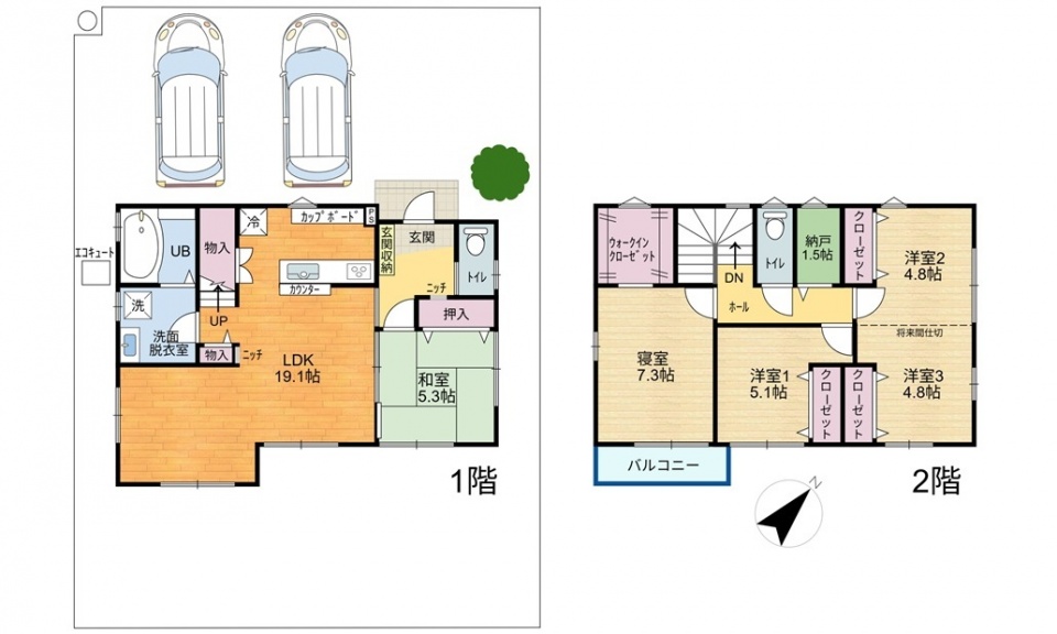オール電化住宅 エコキュート 対面キッチン IHクッキングヒーター 食器洗い乾燥機 カップボード 浴室暖房乾燥機 各階温水洗浄トイレ